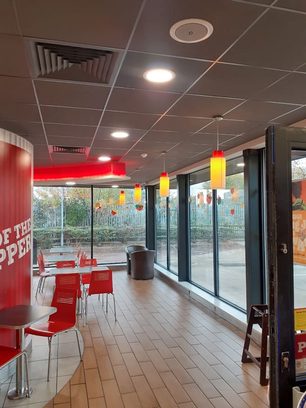 As part of its drive to reduce energy consumption and lower carbon emissions, Burger King UK commissioned HF’s Manchester branch to upgrade the lighting at their Derby restaurants. The project involved the disconnection and removal of the existing lighting system and the supply and installation of modern, energy-efficient LED lighting.