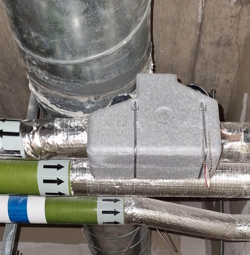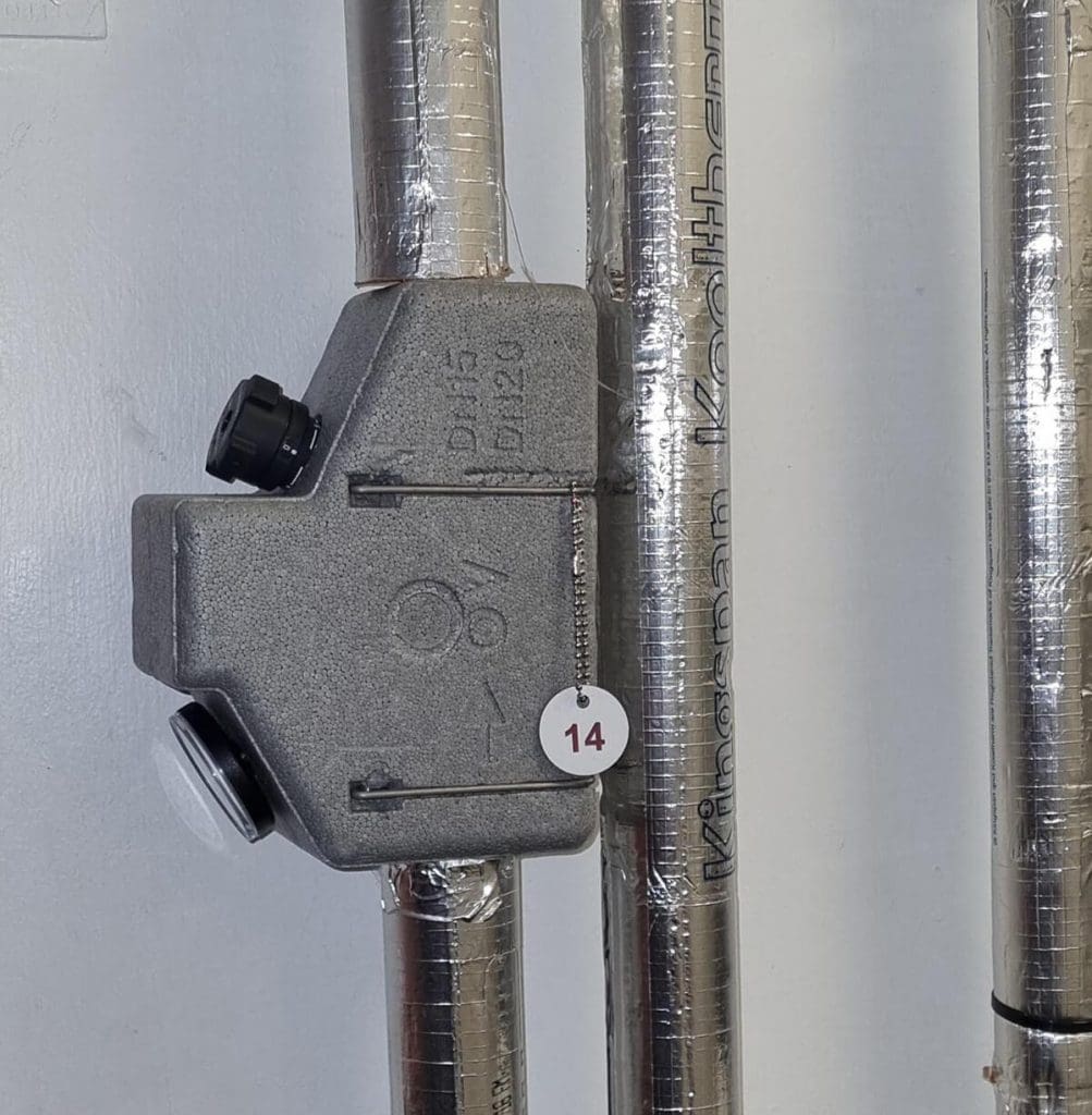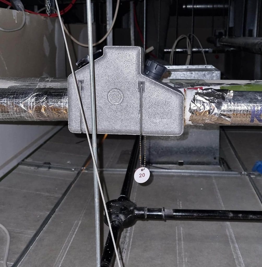 As we were working in a live environment, we were unable to shut off water supplies to the hospital wards and instead had to get creative. We had to locally freeze sections of pipe and install the Thermal Balancing Valves that had been dipped in Sanisil solution (a universal antiviral disinfectant based on hydrogen peroxide and silver) prior to installing to ensure the valves were sterilised and the system cleanliness was not compromised.