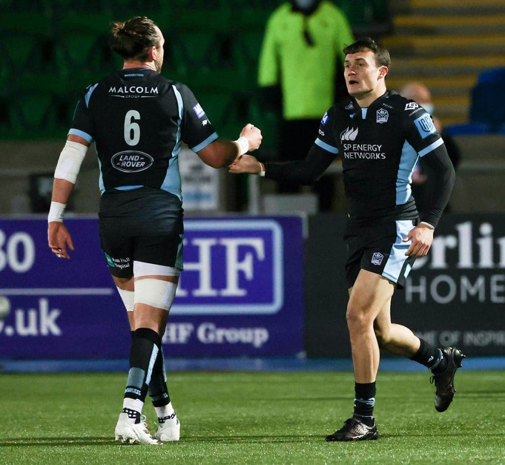 GLASGOW, SCOTLAND – JANUARY 08: Glasgow’s Cole Forbes (R) celebrates scoring the first try of the game during a United Rugby Championship match between Glasgow Warriors and Ospreys at Scotstoun Stadium on January 08, 2022, in Glasgow, Scotland. (Photo by Craig Williamson / SNS Group)